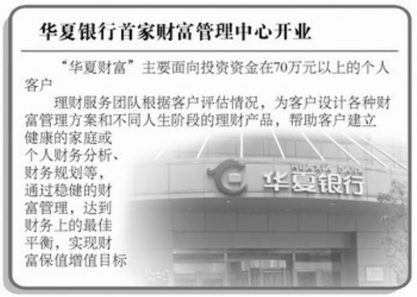本报讯 华夏银行首家财富管理中心日前在京开业,面向投资资金在70万元以上的个人客户,理财服务团队根据客户评估情况,为其设计各种财富管理方案和不同人生阶段的理财产品。 (喻 剑 张艳利)