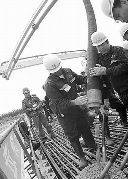 中图:中国建筑股份有限公司施工人员正在为哈大客运专线工程浇筑混凝土。