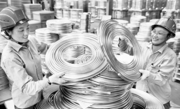 7月16日,位于浙江诸暨市店口镇的浙江海亮股份有限公司内,员工正在生产作业。店口镇年销售额500万元以上企业达200多家,超亿元企业21家。今年上半年,全镇实现工业总产值1913亿元,同比增长23%。 本报记者 李景录摄