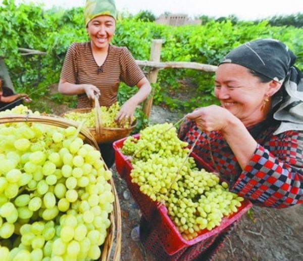 七月十五日,吐鲁番市葡萄乡达甫散盖村村民在采摘无核白葡萄。近日,新疆吐鲁番市无核白葡萄陆续成熟,进入采摘期。 新华社记者 李紫恒摄