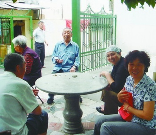 7月16日傍晚,在乌鲁木齐幸福路一住宅小区门口,居民们在纳凉聊天。 本报记者 姜 帆摄