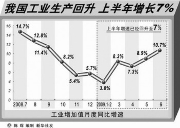 “一个回升”————生产增速稳步回升。今年上半年国内生产总值同比增长7.1%,其中一季度增长6.1%,二季度增长7.9%,二季度比一季度加快了1.8个百分点。这一变化从工业生产看得更清楚,1—2月,规模以上工业生产增长3.8%,3月份增长8.3%,4月份虽有所回落,但5月份又继续回升,增长8.9%,到6月份,增长10.7%。而且在工业行业中,60%以上的行业生产增长加快,在工业产品中近60%的产品生产在加快。