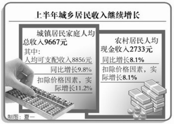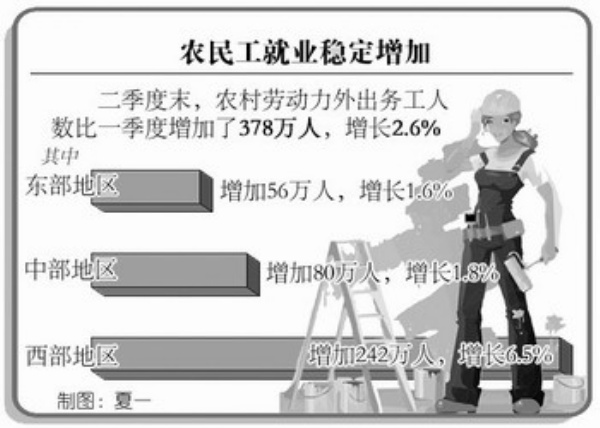 “一个改善”————民生继续得到改善。改善民生是保持经济平稳较快发展的出发点和归宿。民生在极其困难的情况下,又得到了进一步改善。一是就业基本稳定,尤其是农村外出务工人数有所增加。二季度末,农村劳动力外出务工人数比一季度增加了378万人,增长2.6%,其中,东部地区增加56万人,增长1.6%;中部地区增加80万人,增长1.8%;西部地区增加242万人,增长6.5%。二是居民收入增长平稳。上半年,城镇居民人均可支配收入8856元,同比增长9.8%,扣除价格因素,实际增长11.2%。农村居民人均现金收入2733元,同比增长8.1%,扣除价格因素,实际增长8.1%。三是社会保障支出进一步增加,上半年在财政收入压力较大的形势下,财政用于社会保障和就业的支出同比增长29.2%,中央财政对城市居民最低生活保障和农村居民最低生活保障补贴支出分别增长49.9%和140%以上。