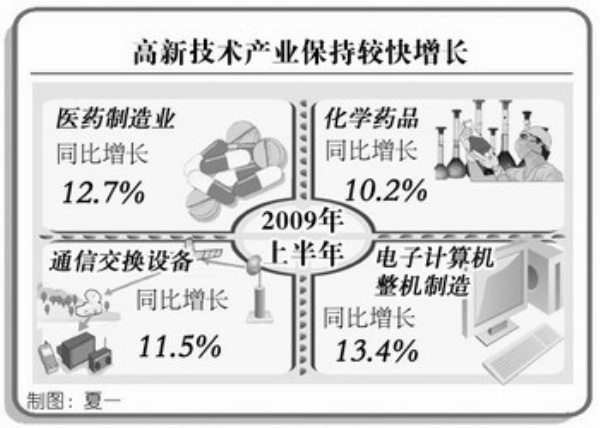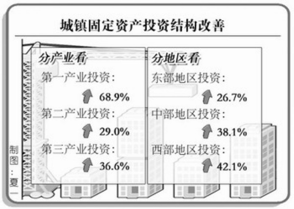 “一个推进”————经济结构调整积极推进。推进结构调整是保持经济平稳较快发展的需要和要求。一是基础设施和基础产业进一步得到加强,上半年基础设施投资(不包括电力)增长57.4%,其中铁路运输业增长126.5%,道路运输业增长54.7%,水利、环境和公共设施管理业增长54.5%;卫生、社会保障和社会福利业增长71.3%;文化、体育和娱乐业增长57.1%。二是装备工业较快回升,上半年装备工业同比增长6.7%,比一季度加快3.0个百分点。三是区域发展协调性有所增强,中西部地区投资和工业生产增长都明显加快。城镇固定资产投资方面,中部地区增长38.1%,西部地区增长42.1%,都快于东部地区的26.7%;分地区看,工业生产方面,规模以上工业增加值中部地区增长6.8%,西部地区增长13.2%,也都快于东部地区的5.9%。