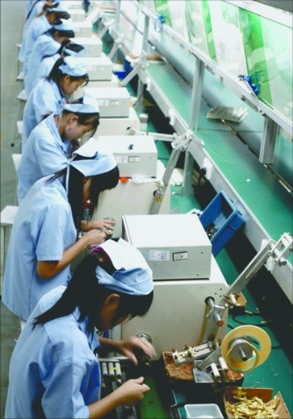 广盛电子(南昌)有限公司电源供应器、继电器生产车间,工人们正在进行生产。