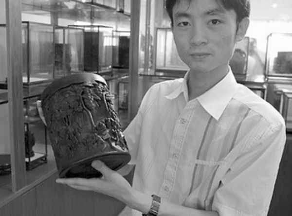 图2:竹风堂经理朱伟展示他的紫檀木雕笔筒。