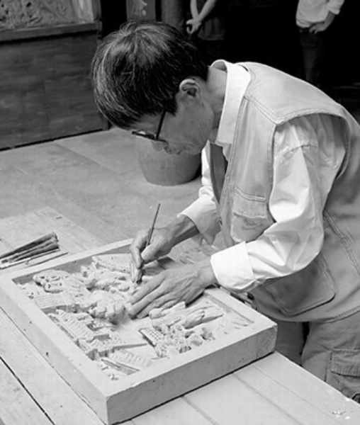 图5:徽州砖雕国家级传承人方新中在潜口民宅传习基地内制作砖雕作品。
