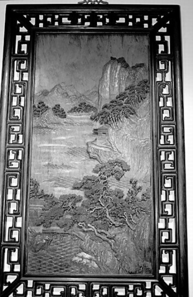 图6:全国优秀青年工艺美术家洪建华的木雕作品《山水中堂》。