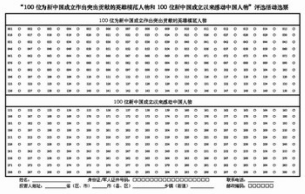 3.候选人代码由三位阿拉伯数字组成,每位候选人对应唯一代码。“100位为新中国成立作出突出贡献的英雄模范人物”候选人代码为001—150,“100位新中国成立以来感动中国人物”候选人代码为151—300(候选人按姓氏笔画排序)。投票时填写候选人代码即可。