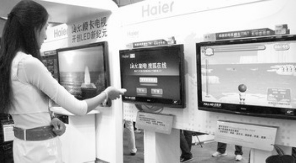上图:消费者正在与海尔模卡电视互动玩游戏。 本报记者 胡考绪摄