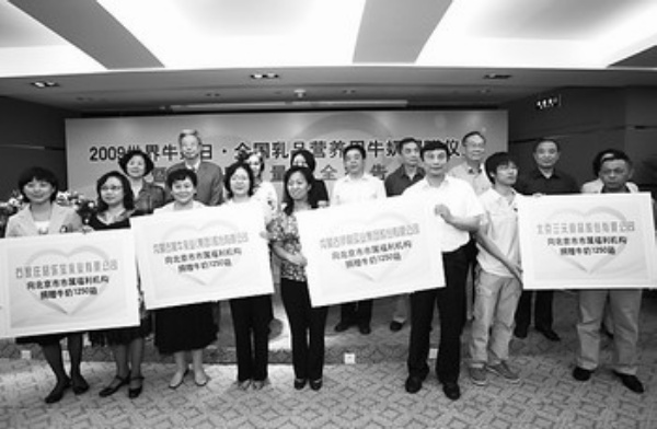 6月9日,由中国乳制品工业协会主办的主题为“国产牛奶放心喝”的全国乳品营养周宣传活动在北京举行。伊利、蒙牛、三元和君乐宝四家乳企向北京市属社会福利院捐赠了5000箱牛奶。