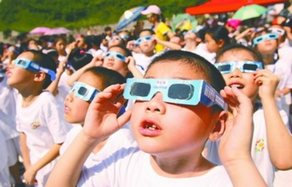 上图 7月22日上午,在温州市青少年活动中心,参加暑期夏令营的近千名小朋友聚集在广场观看日食奇观。