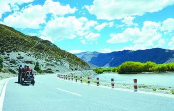 左图 7月20日,一辆拖拉机在通往日喀则江孜的油路上行驶。
