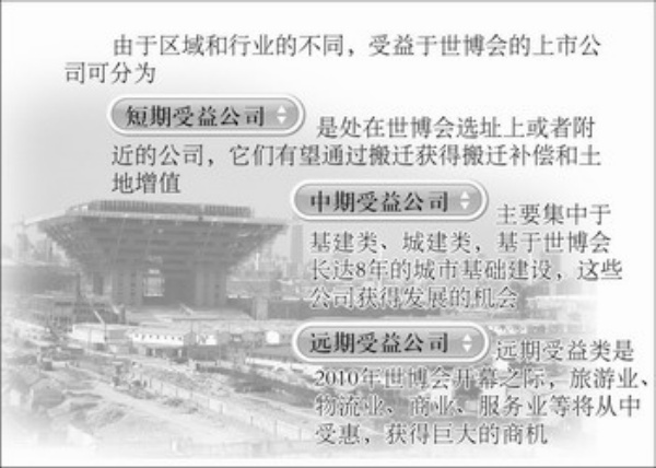 由于区域和行业的不同,这些上市公司可分为短期受益公司、中期受益公司和远期受益公司。短期受益上市公司是处在世博会选址上或者附近的公司,它们有望通过搬迁获得搬迁补偿和土地增值;中期受益上市公司主要集中于基建类、城建类,基于世博会长达8年的城市基础建设,这些公司获得发展的机会;远期受益上市公司则是2010年世博会开幕之际,世界各国的游客云集上海,届时旅游业、物流业、商业、服务业等将从中受惠,获得巨大的商机。