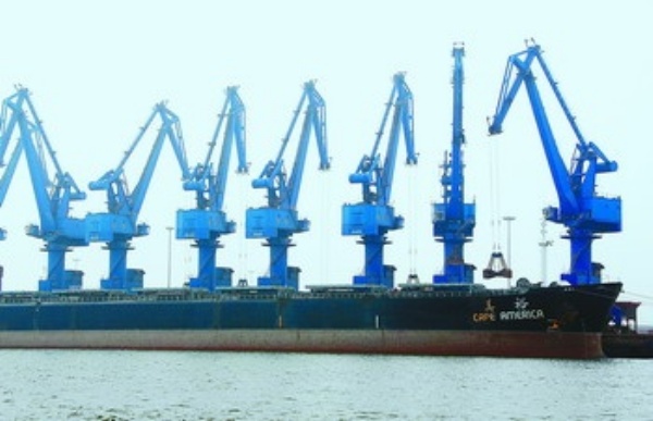 7月24日拍摄的天津港一矿石码头。据天津港统计,今年上半年,该港累计完成货物吞吐量1.84亿吨,集装箱完成416.1万标准箱,分别比去年同期增长1.2%和1.9%。 扈 明摄 (新华社发)