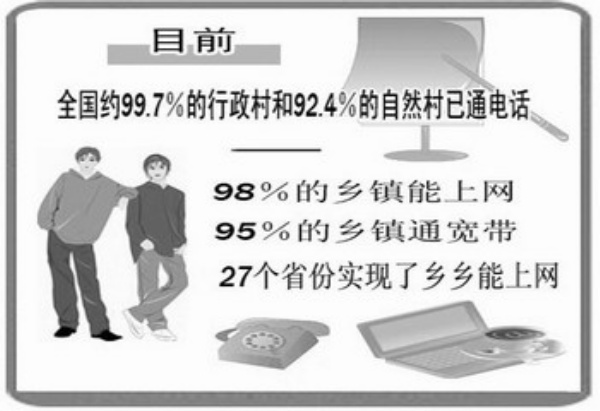为加快农村通信网络建设,从2004年开始,我国启动了“村村通电话”工程,并逐步从行政村向自然村延伸。2007年12月,财政部、商务部、工业和信息化部联合启动了“家电下乡”活动,先后把手机和电脑纳入补贴范围,快速提高了手机和电脑在农村的普及率。