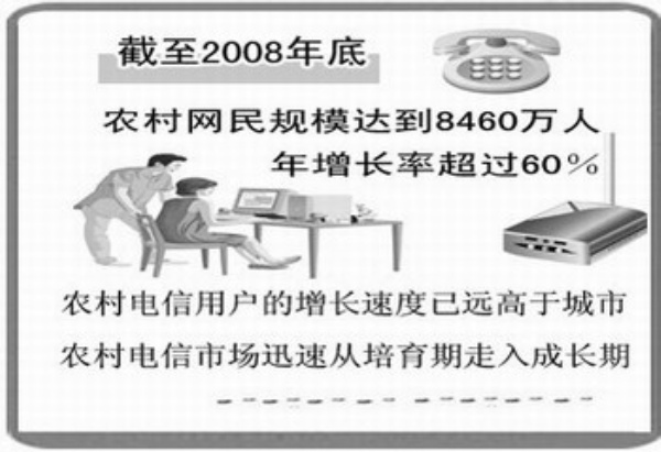 伴随着村村通电话工程的深入,电信运营商纷纷提出农村宽带战略,为农村信息化应用奠定了基础。目前,全国约99.7%的行政村和92.4%的自然村已通电话。与此同时,我国98%的乡镇能上网、95%的乡镇通宽带,27个省份已经实现乡乡能上网。到2008年底,农村网民规模达到8460万人,年增长率超过60%,农村电信用户的增长速度已远高于城市,农村电信市场迅速从培育期走入成长期。