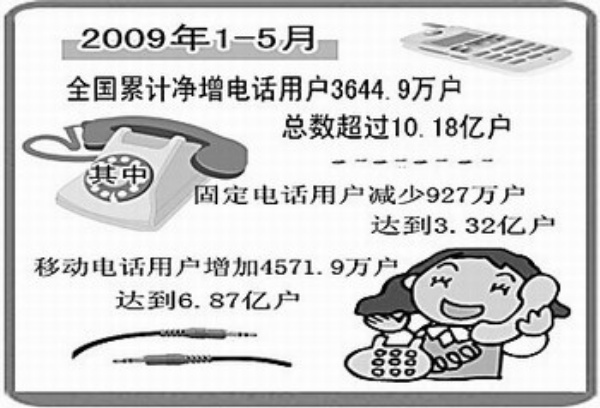 从今年3月份开始,我国电话用户总数突破10亿户大关。到5月底,我国电话用户总数已突破10.18亿户。其中,固定电话用户为3.32亿户;移动电话用户达到6.87亿户。截至今年5月底,互联网宽带接入用户达到9162.9万户。