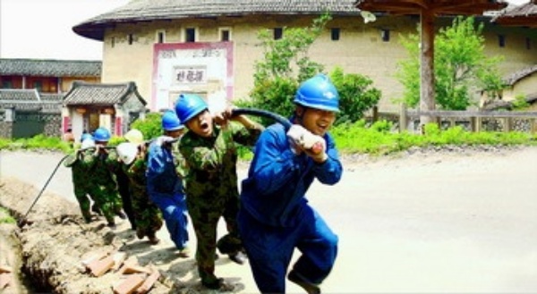 图2:永定土楼景区,龙岩电业局工人们正在实施缆化改造工程,确保景点电力供应安全稳定,为保护世界文化遗产做出了贡献。