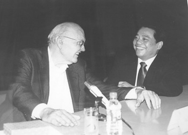 下图:2001年,王阳元在北京与集成电路发明人J.S.Kilby亲切交谈。