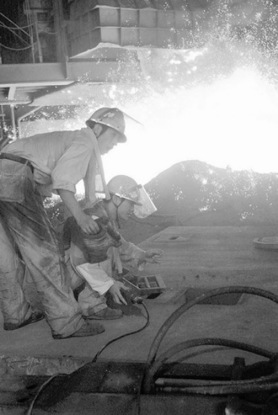 左图:武钢集团员工在炼钢炉前工作的场景。
