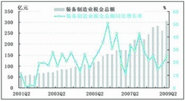 税金:经初步季节调整,2009年二季度,装备制造业上缴税金总额为306.7亿元,与上季度相比增长17%,与上季度的同比增速相比提升了6.5个百分点;与去年同期相比增长24.8%,总体保持稳中有升的态势。