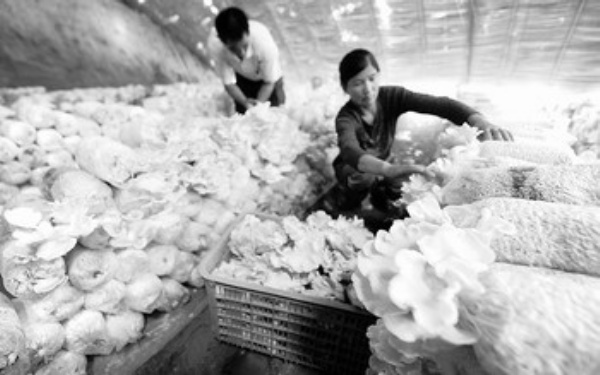 7月20日,伊宁市塔什库勒克乡菜农在大棚里采摘五彩菇。