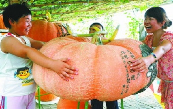 为了增加南瓜的观赏价值,在南瓜刚结果时,技术人员就在瓜身上刻绘各种图案,收获时清晰可见。