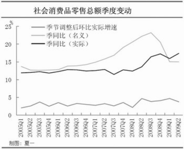人民银行这份报告认为,今年以来消费稳步增长,投资快速增长。上半年,社会消费品零售总额名义增长15.0%,比去年同期回落6.4个百分点;实际增长16.6%,比去年同期加快3.7 个百分点,处于较高水平。人民银行调查统计司据此测算,二季度当季,社会消费品零售总额同比实际增速为17.4%,比去年同期加快3.8个百分点;季节调整后,环比实际增速为3.7%,比上季降低1.0个百分点,比去年同期降低1.0个百分点。
