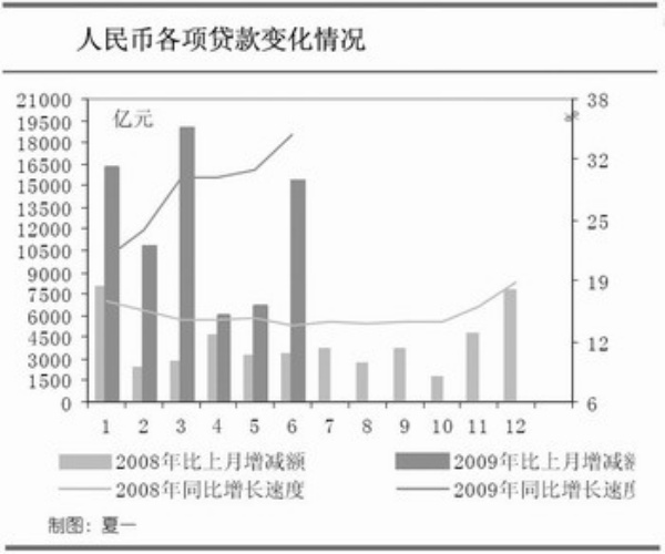 今年以来,贷款持续大量投放。上半年累计,新增人民币贷款7.4万亿元,同比多增4.9万亿元,比去年全年新增贷款还多2.5万亿元。6月末,金融机构人民币贷款同比增长34.4%,增速分别比上月末和上年末上升3.8个和15.7个百分点。贷款增长速度和新增额均创近年来最高纪录。