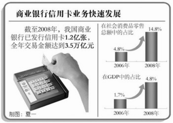 本报讯 银监会日前公布的数据显示,截至2008年,我国商业银行已发行信用卡1.2亿张,全年交易金额达到3.5万亿元。信用卡总消费金额在社会消费品零售总额中的占比从2006年的4.8%上升至2008年的14.8%,在GDP中的占比从2006年的1.7%上升至2008年的4.8%,对促进消费、拉动内需起到了重要的推动作用。 (赵晓强)