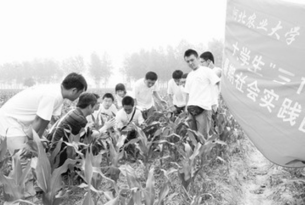 7月15日,在河北省藁城市国家粮食丰产科技工程课题项目区,河北农业大学的老师(左二)正在给学生讲解玉米田间管理技术。 新华社记者 王 民摄