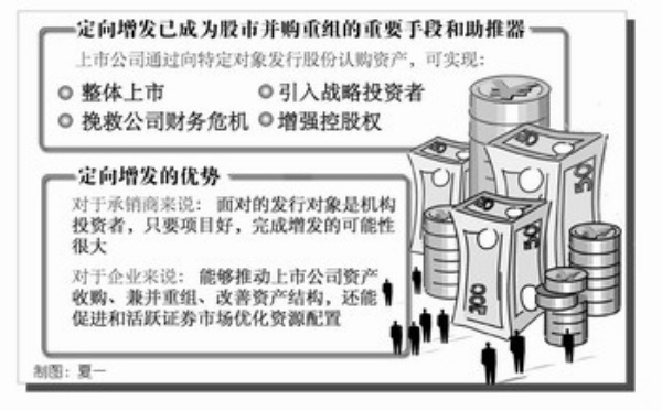 市场人士认为,定向增发已经成为股市并购重组的重要手段和助推器,上市公司通过向特定对象发行股份认购资产,可实现整体上市、引入战略投资者、挽救财务危机公司、增强控股权等效果。因此,市场往往对定向增发报以积极态度,上市公司的扩容反而变成了利好因素。