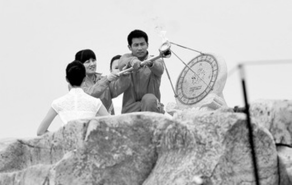 在距离泰山玉皇顶100余米的地方,是一个由天然大石形成的平台,面积40平方米左右。当日一大早,聚光镜就被安放在这里。聚光镜是一个日晷造型,直径半米的石制圆盘前方,就是巴掌大的聚光镜,它靠三根半米长的金属线支撑着,镜面朝向太阳升起的方向。石盘四周刻着十二天干,中心则刻画着十一运会标志。