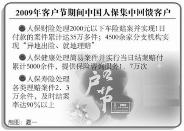 今年的客户节上,就有中国人保财险对车险理赔服务标准进一步提高的承诺;有中国人保健康对责任清楚、资料齐全的简易案件实行当日结案的承诺等。中国人保还利用自己作为2008年北京奥运会、2010年上海世博会和广州亚运会保险合作伙伴的优势,以分享门票等增值活动的方式携手客户参与奥运会、体验世博会和亚运会。
