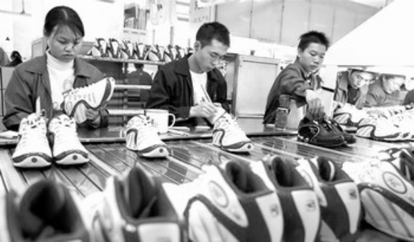 上图:晋江鞋业的工作车间,工人们正在加工运动鞋。 施 凉摄