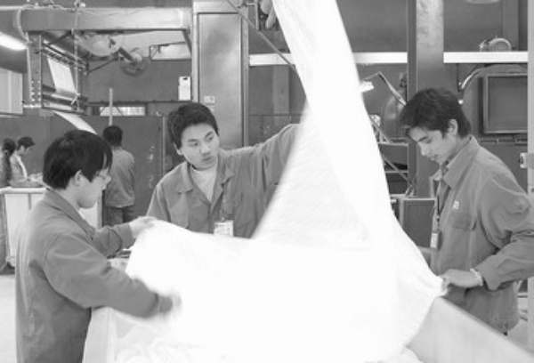 下图:福建长乐市东龙染整厂的工人正在生产化纤产品。 本报记者 陈 煜摄