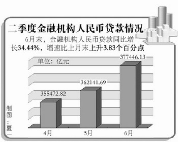 来自中央银行公布的统计数字显示,今年6月末,金融机构人民币各项贷款余额37.74万亿元,同比增长34.44%,增幅比上年末高15.71个百分点,比上月末高3.83个百分点。上半年人民币各项贷款增加7.4万亿元,同比多增4.92万亿元,这一数字创下了改革开放以来的历史最高水平。