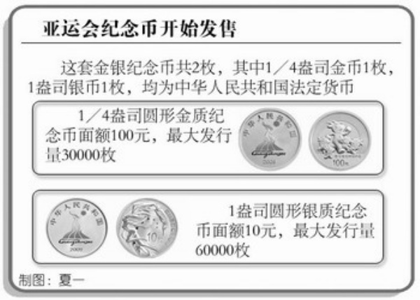 本报讯 为纪念第16届亚洲运动会在我国广州举办,中国人民银行日前发行第16届亚洲运动会金银纪念币(第一组)一套,中国金币总公司从即日起面向海内外公开销售。该套金银纪念币正面图案均为第16届亚洲运动会彩色会徽,并刊国名、年号。金币背面图案为吉祥物和跑道组合设计。银币背面图案为田赛、径赛和跳水运动员等装饰造型设计。 (殷 楠)