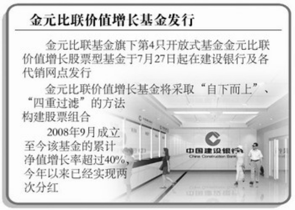 本报讯 金元比联基金旗下第4只开放式基金金元比联价值增长股票型基金于7月27日起在建设银行及各代销网点发行。金元比联价值增长基金将采取“自下而上”、“四重过滤”的方法构建股票组合。据Wind统计,2008年9月成立至今该基金的累计净值增长率超过40%,今年以来已经实现两次分红。 (苏 萍)