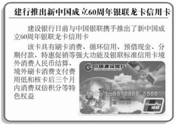 本报讯 此次新中国成立60周年银联龙卡信用卡的发行是建行与中国银联携手合作的又一重要成果。建行自2006年8月发行首张银联品牌龙卡大学生卡以来,先后发行了龙卡网球卡、香港旅游卡、财政公务卡、冠军足球卡等多个银联品牌特色信用卡产品。建行表示将与银联紧密协作,进一步提升建行信用卡产品的市场影响力和综合竞争力,提高建行银联品牌信用卡的市场份额。