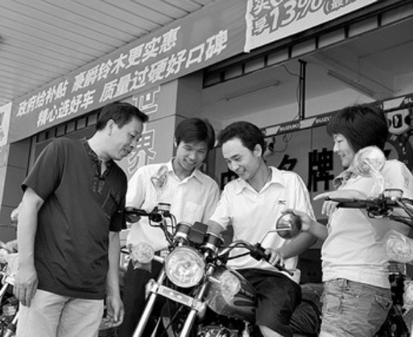 国家“摩托车下乡”方案实施以来,江西省安远县农民购买摩托车的热情高涨,农民得实惠的同时也大大激活了农村消费市场,在全县各大摩托车经销网点,随处可见前来选购摩托车的农民。图为安远县欣山镇的农民在该县一家摩托车专卖店选购摩托车。