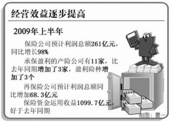 经营效益逐步提高。上半年,保险公司预计利润总额261亿元,同比增长98%。承保盈利的产险公司有11家,比去年同期增加了3家,盈利险种增加了3个。再保险公司预计利润总额同比增加68.3亿元。保险资金运用收益1099.7亿元,好于去年同期。