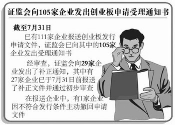 本报讯 证监会日前公布了创业板上市申请和受理情况,截至7月31日,已有111家企业报送创业板发行申请文件,证监会已向其中的105家企业发出受理通知书。在111家报送企业中,证监会向29家企业发出了补正通知,其中有27家企业已报送了补正文件并通过初步审查,另有2家企业尚未报送补正文件。(刘 溟)