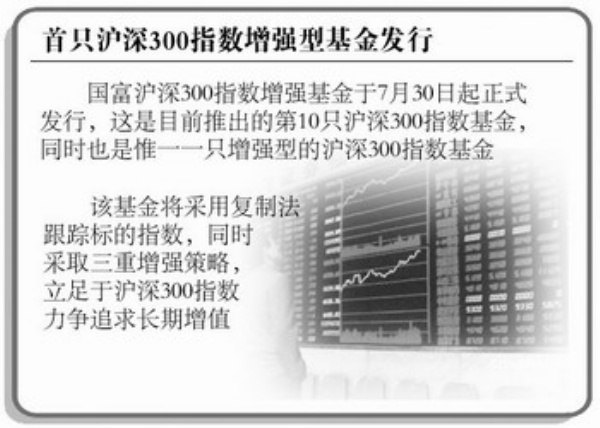 本报讯 国海富兰克林旗下第7只产品————国富沪深300指数增强基金于7月30日起正式发行,这是目前推出的第10只沪深300指数基金,同时也是惟一一只增强型的沪深300指数基金。该基金将采取三重增强策略,通过仓位调整、行业配置、个股选择等优化投资组合,发挥主动管理能力。 (付丽嘉)
