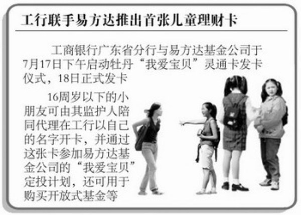 本报讯 工商银行和易方达基金公司于近日联合推出牡丹“我爱宝贝”灵通卡。该卡旨在倡导儿童培养理性投资理财的观念,该业务推出后,16周岁以下的小朋友可由其监护人陪同代理在工行以自己的名字开卡,并通过这张卡参加易方达基金公司的定投计划。(王 璐)
