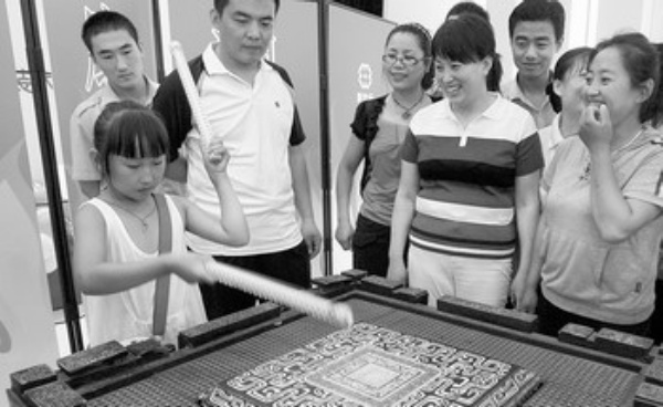 8月7日,来自黑龙江的11岁小姑娘于淼(左)体验击打“奥运缶”。当日,在北京市丰台区新世纪服装商贸城内摆放了三个北京奥运会开幕式上使用过的“奥运缶”,以纪念北京奥运会成功举办一周年并满足市民的奥运情结。 新华社发