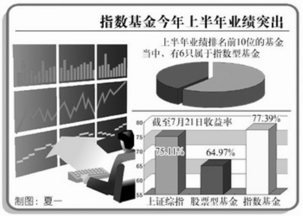 上半年A股市场强势上涨,指数基金业绩突出,以上半年平均68.3%的业绩获得关注。截至7月21日,上证综指上涨75.11%,股票型基金平均收益率为64.97%,而指数基金平均收益已达77.39%,其中业绩最佳者收益超过100%,远远超越其他类型基金。上半年业绩排名前10位的基金当中,有6只属于指数基金。