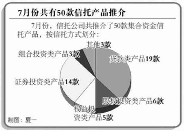 本报讯 7月份,信托公司共推介了50款集合资金信托产品,按投资领域可分为:投资于房地产企业的产品12款,投资于基础设施领域的产品7款,投资于金融领域的16款,投资实业的有13款,其他领域2款。在这50款产品中年预期收益率最高的达10%,最低的为4.5%;产品规模最大的达5亿元,最小的为300万元。 (张 衍)
