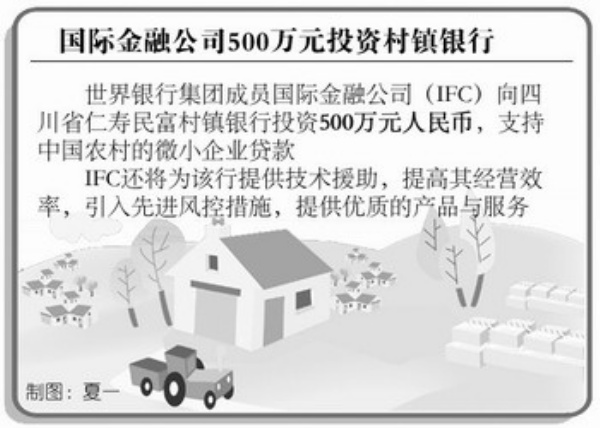 本报讯 世界银行集团成员国际金融公司向四川省仁寿民富村镇银行投资500万元人民币,支持中国农村的微小企业贷款。IFC驻中国首席代表叶迈克先生指出:“仁寿民富村镇银行将为四川中部的农民和农村企业提供急需的资金。为农业发展提供资金。”据了解,该村镇银行大股东为乐山市商业银行。 (王 璐)